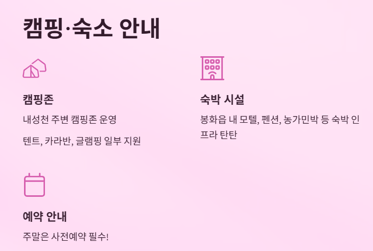 - 봉화읍 내 모텔, 펜션, 농가민박 등 숙박 인프라 탄탄